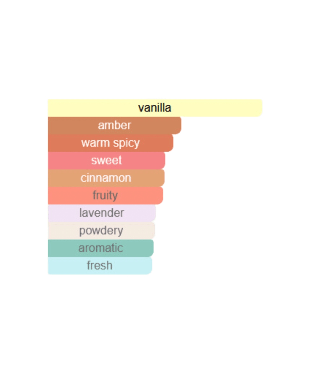 La apertura combina manzana verde y canela, logrando un contraste entre frescura frutal y dulzor especiado que se siente moderno y juvenil. En el corazón aparece la lavanda, que aporta un guiño aromático clásico y equilibra el azúcar sin quitarle sensualidad. El fondo es protagonista: vainilla cremosa, ámbar y maderas, responsables de esa estela adictiva, cálida y persistente que lo volvió tan popular.